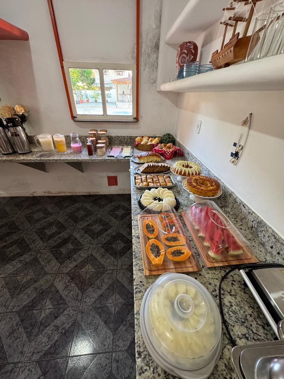 Nosso café da manhã é cuidadosamente preparado com dedicação e carinho em cada detalhe. São diversas opções para iniciar repleto de energia, temos opções como frutas, pães, bolos caseiros e bebidas que despertam os sentidos. Tudo isso preparado para você iniciar o dia da melhor forma!